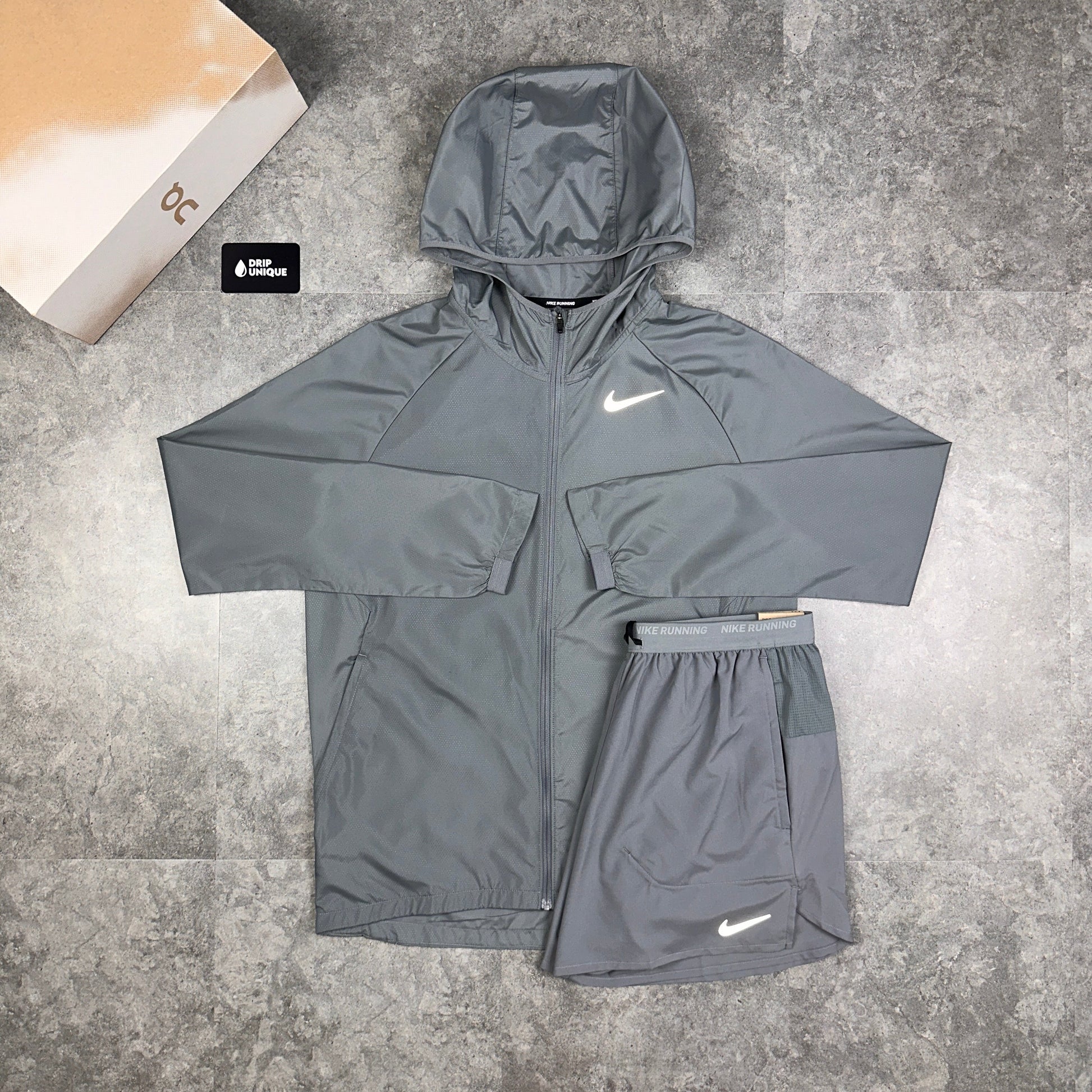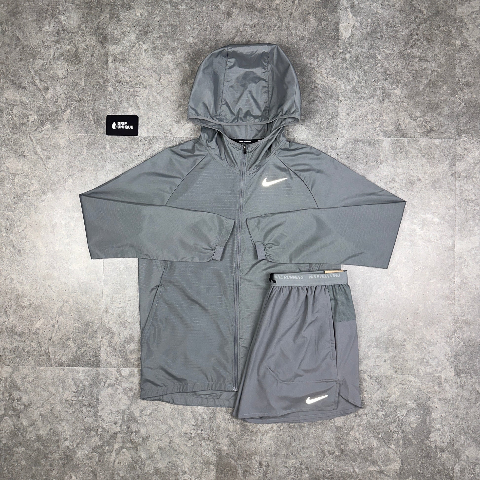 Nike Essential Windrunner Jacket Grey & Grey Flex Stride Shorts Set