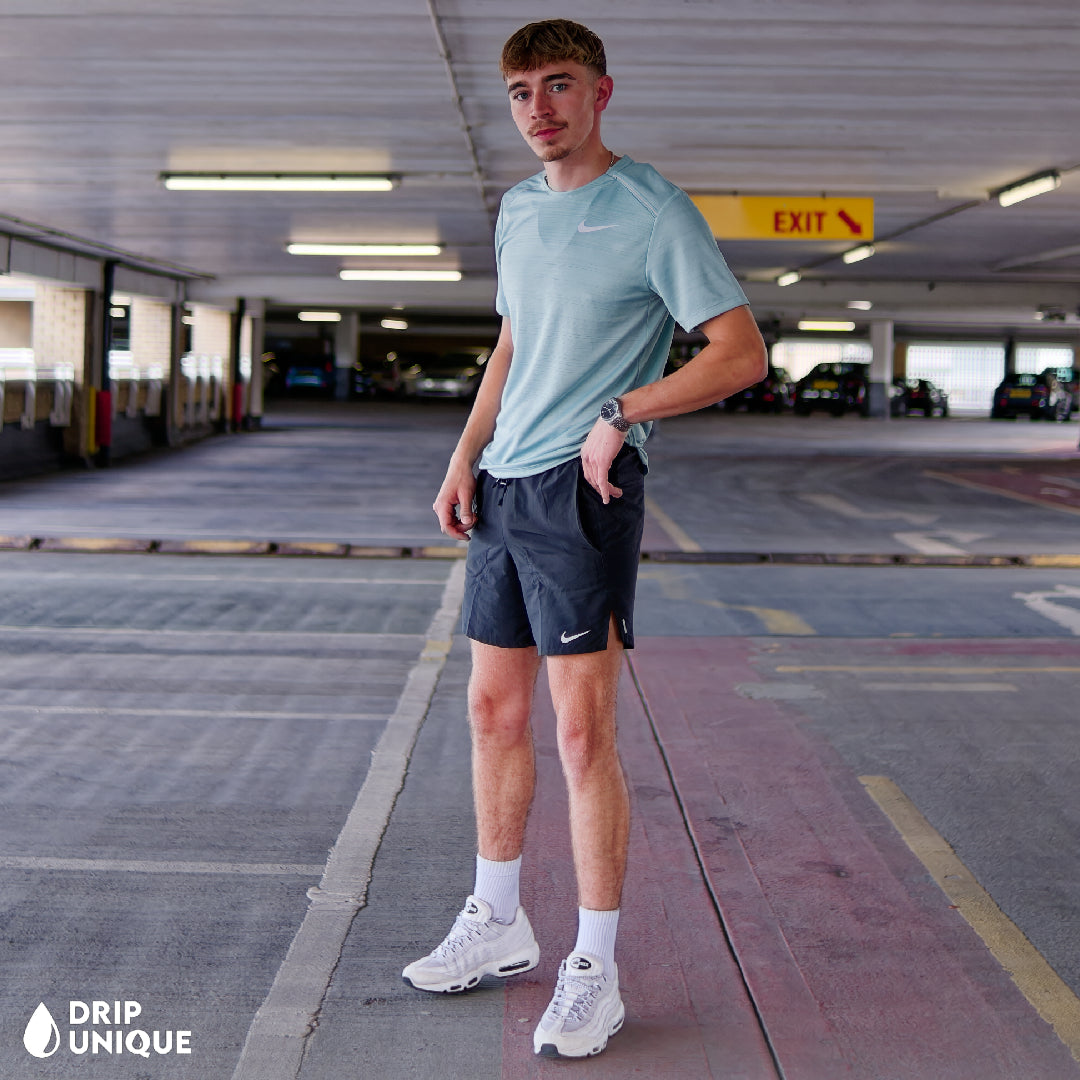 Workout harder with the bestselling Nike Miler T-Shirt Set. In a new Mineral colourway, this Nike Miler Set features Dri Fit Technology, which provides breathability and comfort by wicking away sweat, and with a comfortable and relaxed fit, this Nike Set is perfect for any task. Paired with the classic Nike Flex Stride shorts in a black colourway to complete the look.